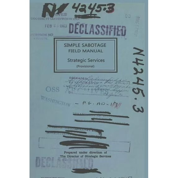 The context or discovery of this document was from a discussion on how in a family, in an organization, or even in a larger context, there are subtle and not so subtle ways of disruption. The disruptive activities can be bilateral: from workers in a company and from management of the company for example. The booklet was intended for operatives working behind enemy lines in World War II. It is from the precursor of the Central Intelligence Agency (CIA) known as the Office of Strategic Services (OSS). It was written in 1944 and signed off by William Donovan.